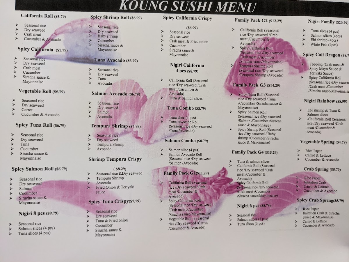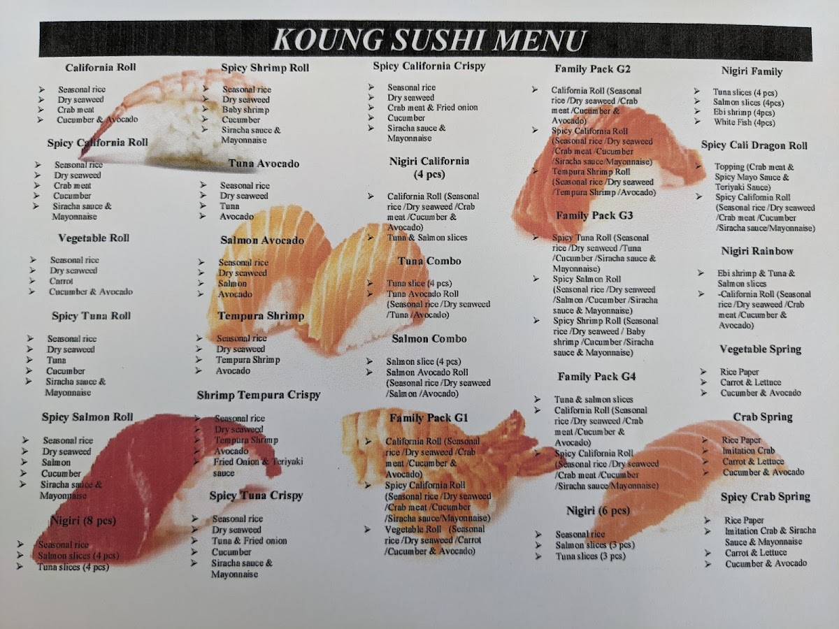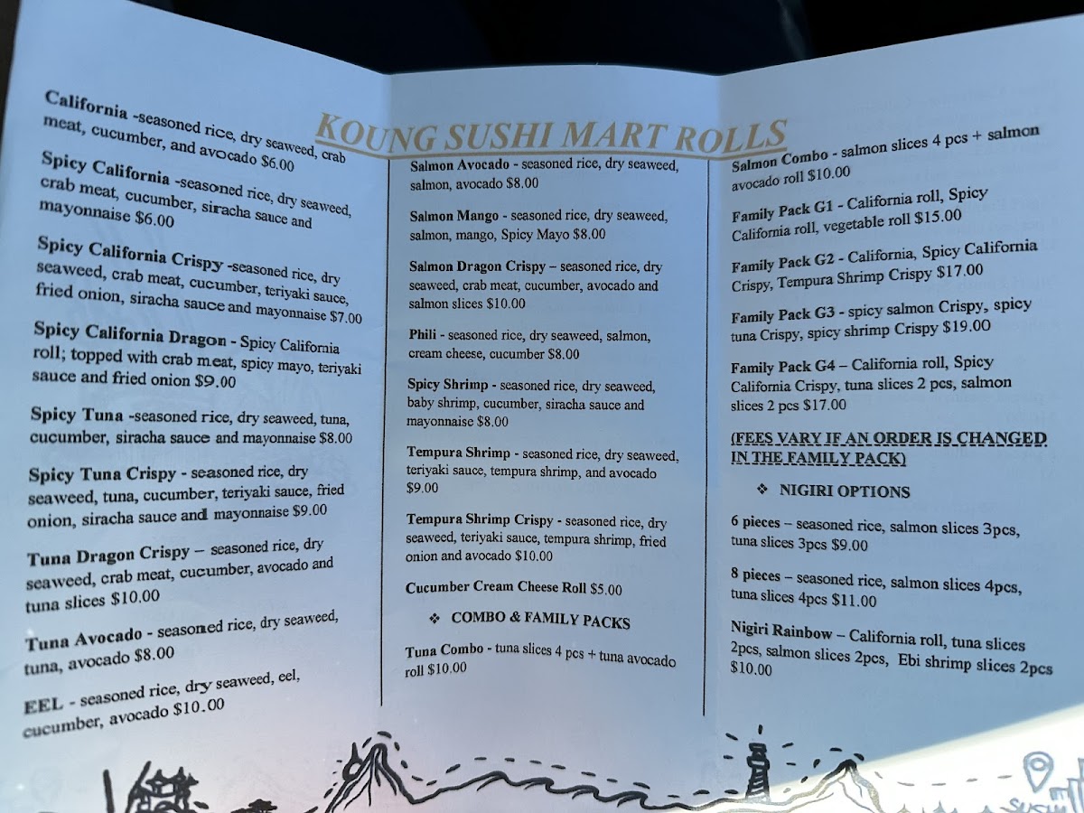 Finally, if you're craving something with a bit of heat, the Spicy Rolls-including the Spicy California Roll and the Spicy Tuna Crispy Roll-are sure to satisfy. Don’t miss the Nigiri & Sashimi options, which feature a selection of Nigiri and Sashimi pieces, including Eel Nigiri. With such a varied and affordable menu, Koung Sushi Mart is an ideal spot for sushi lovers of all kinds.